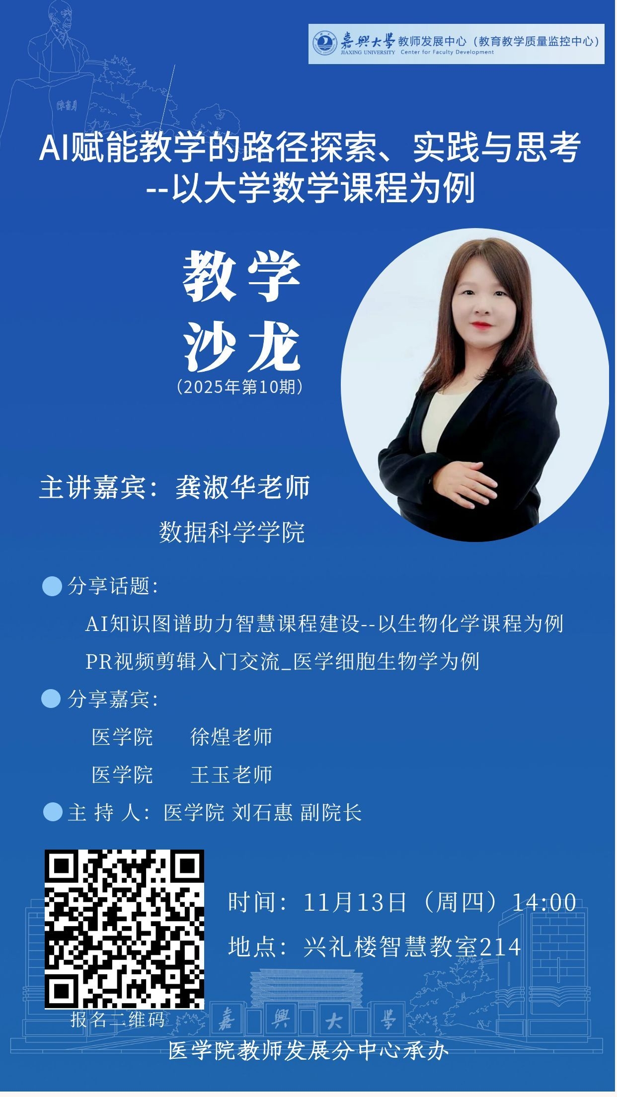 嘉兴大学2025年第十期教学沙龙活动即将启动,将由医学院教师发展分中心承办,商学院、附属医院协办,现就有关事项通知如下: