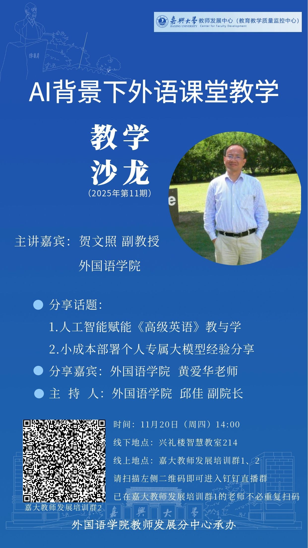 | 2025/11/20- 2025/11/20 | 线下地点:兴礼楼智慧教室214; 线上地点:嘉大教师发展培训群1、2。 | 2025/11/17 | 2025/11/20 |