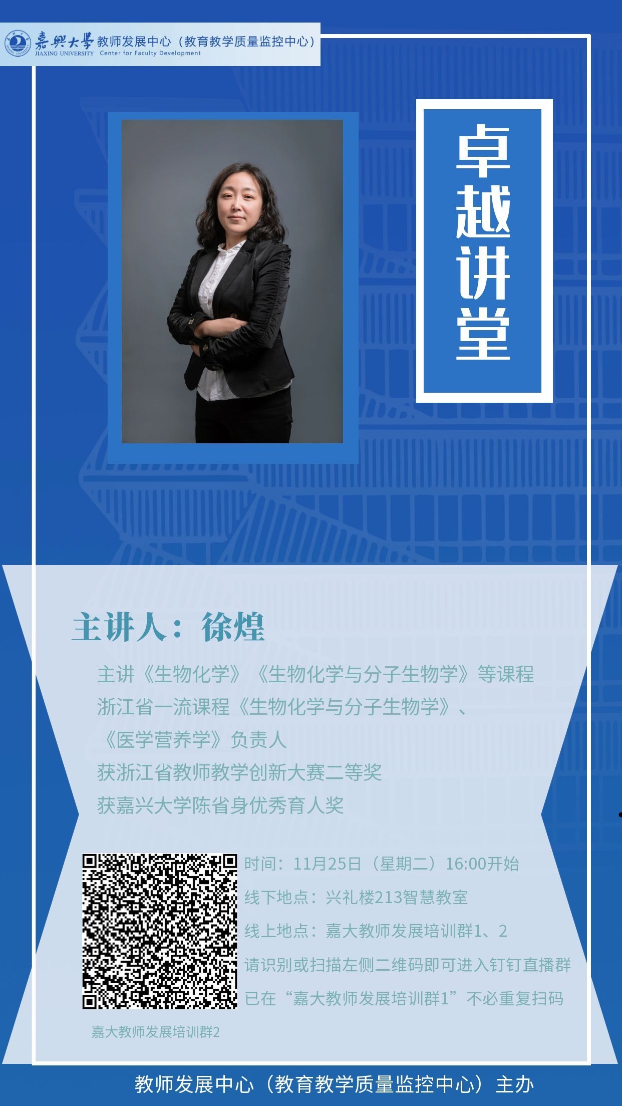 | 徐煌 | 11月25日(周二)第 9节,16:00 | 兴礼楼 智慧教室 213 | 嘉大教师发展培训群1/2 |
