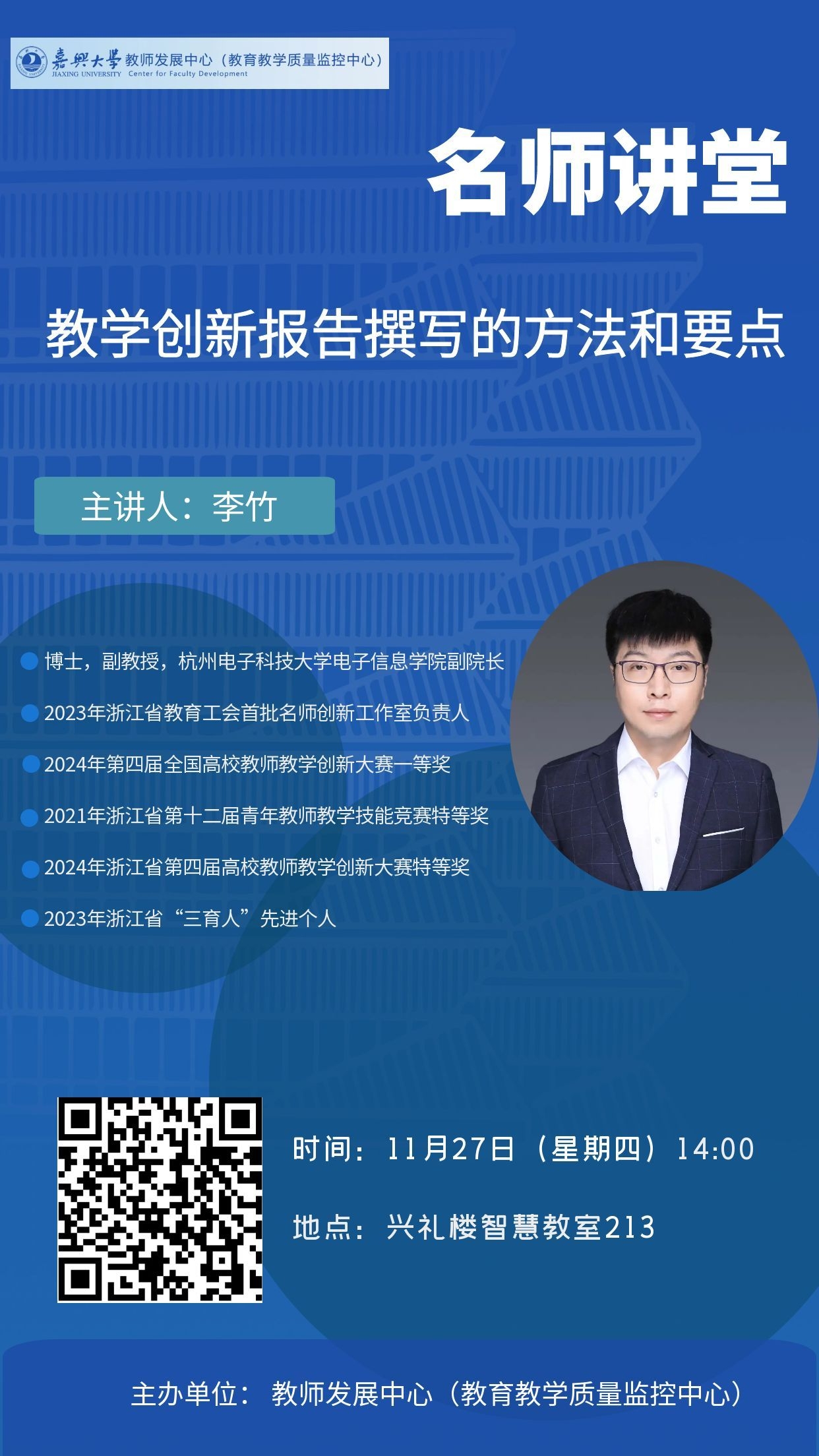 请用钉钉扫描海报二维码报名。报名截止日期:11月27日12:00。全程参与教师可获相应培训学时。