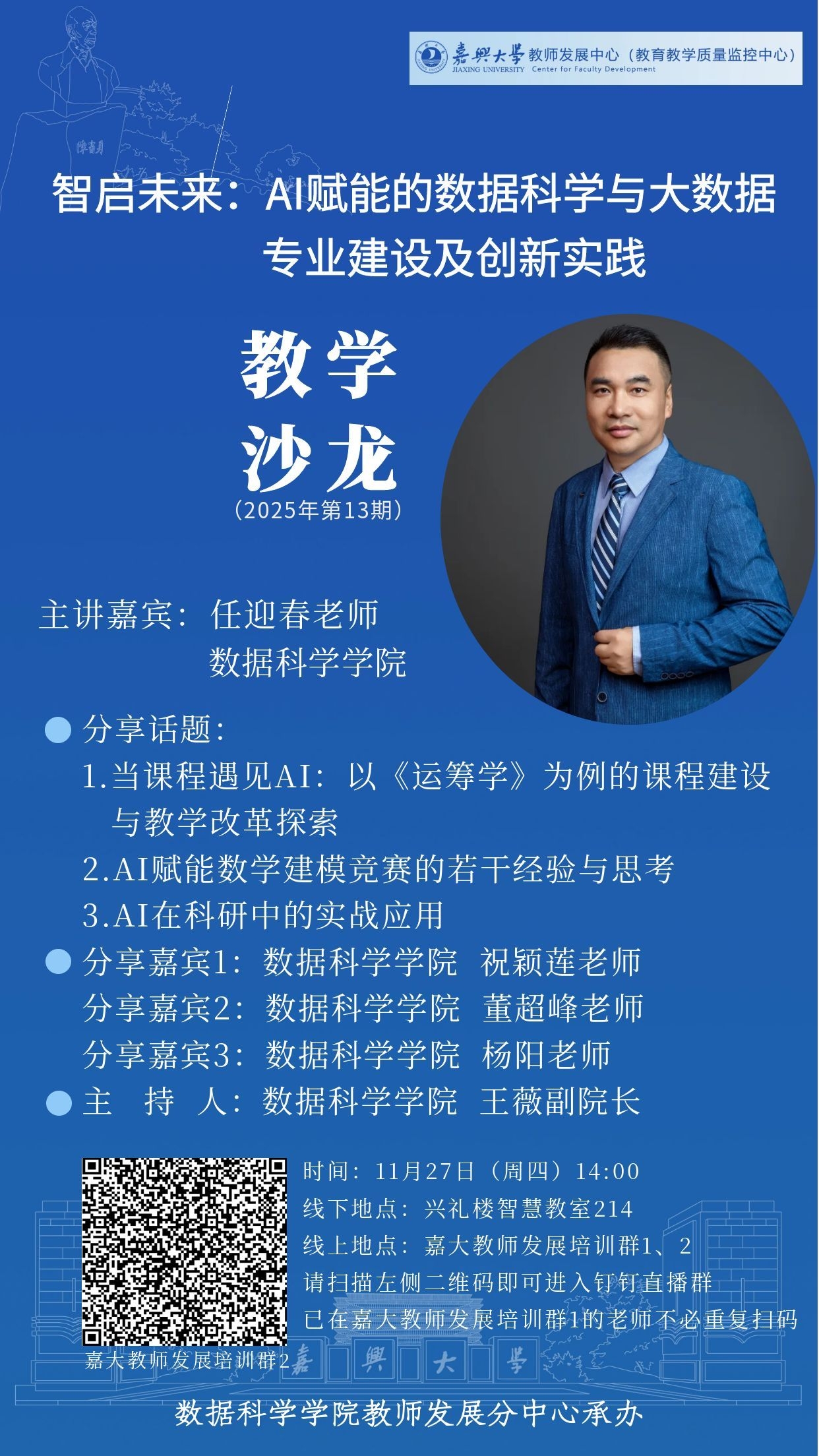 嘉兴大学2025年第十三期教学沙龙活动即将启动,将由数据科学学院教师发展分中心承办,商学院、医学院协办,现就有关事项通知如下: