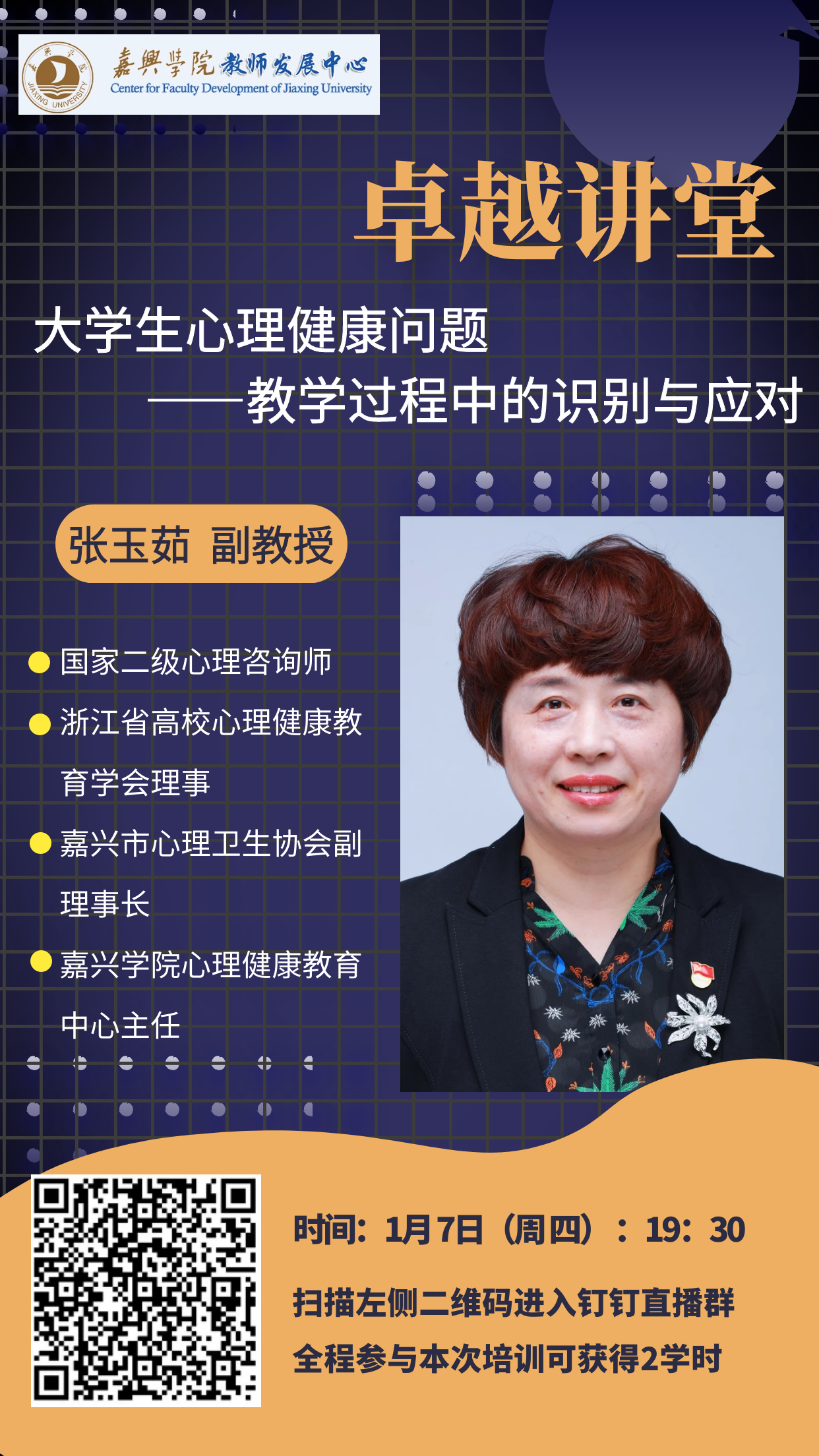 为提升教师对于大学生心理问题的识别与应对能力,进一步完善学校心理育人体系,营造积极健康的校园文化氛围,教师发展中心“卓越讲堂”特邀马克思主义学院张玉茹副教授做专题讲座,现将具体事项通知如下: