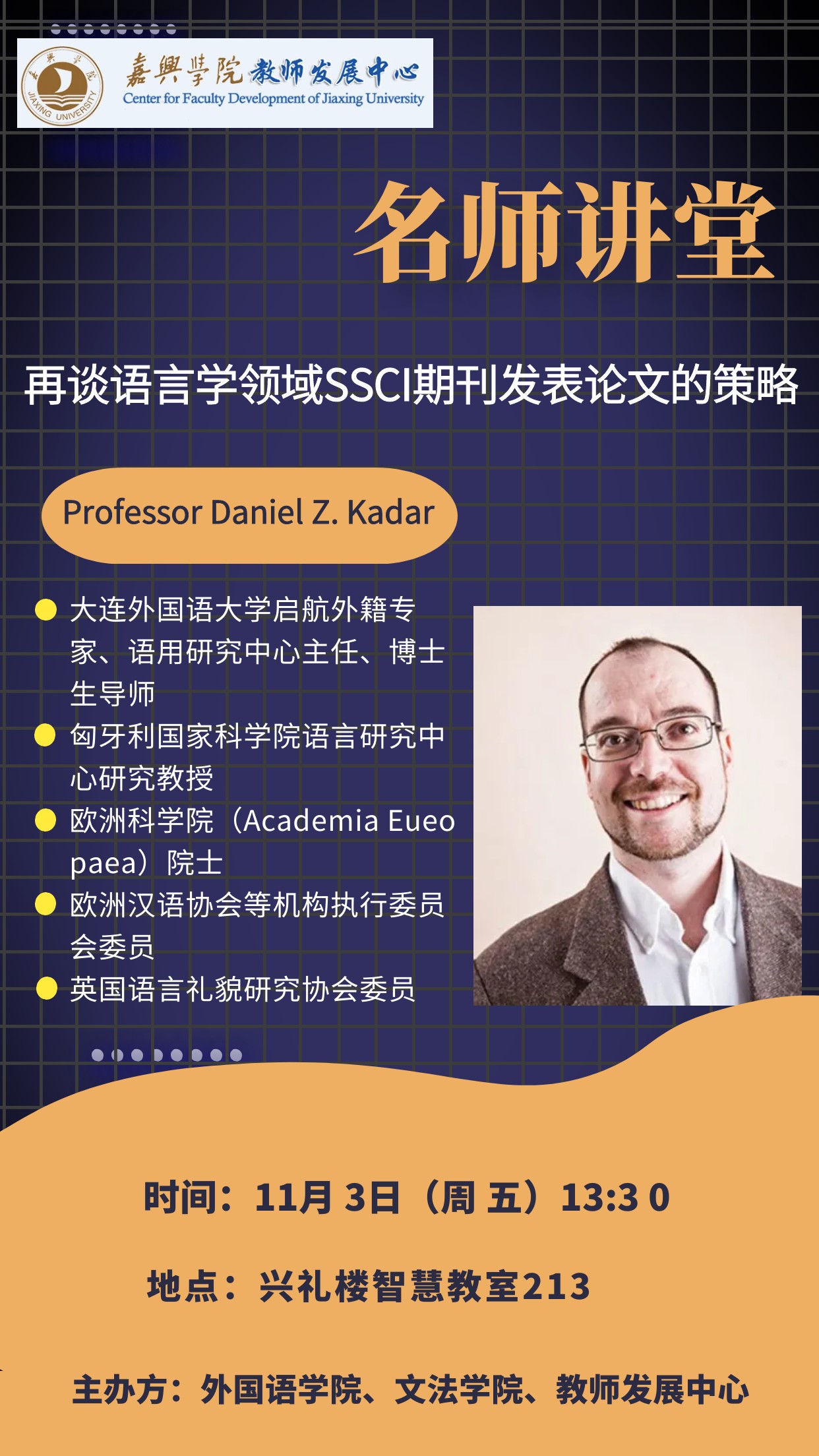 为有效解决我校教师在SSCI期刊发表论文常见的困难,帮助教师发表高质量论文,教师发展中心联合外国语学院、文法学院特邀大连外国语大学Daniel Z. Kadar教授来校做专题讲座,现将具体事项通知如下: