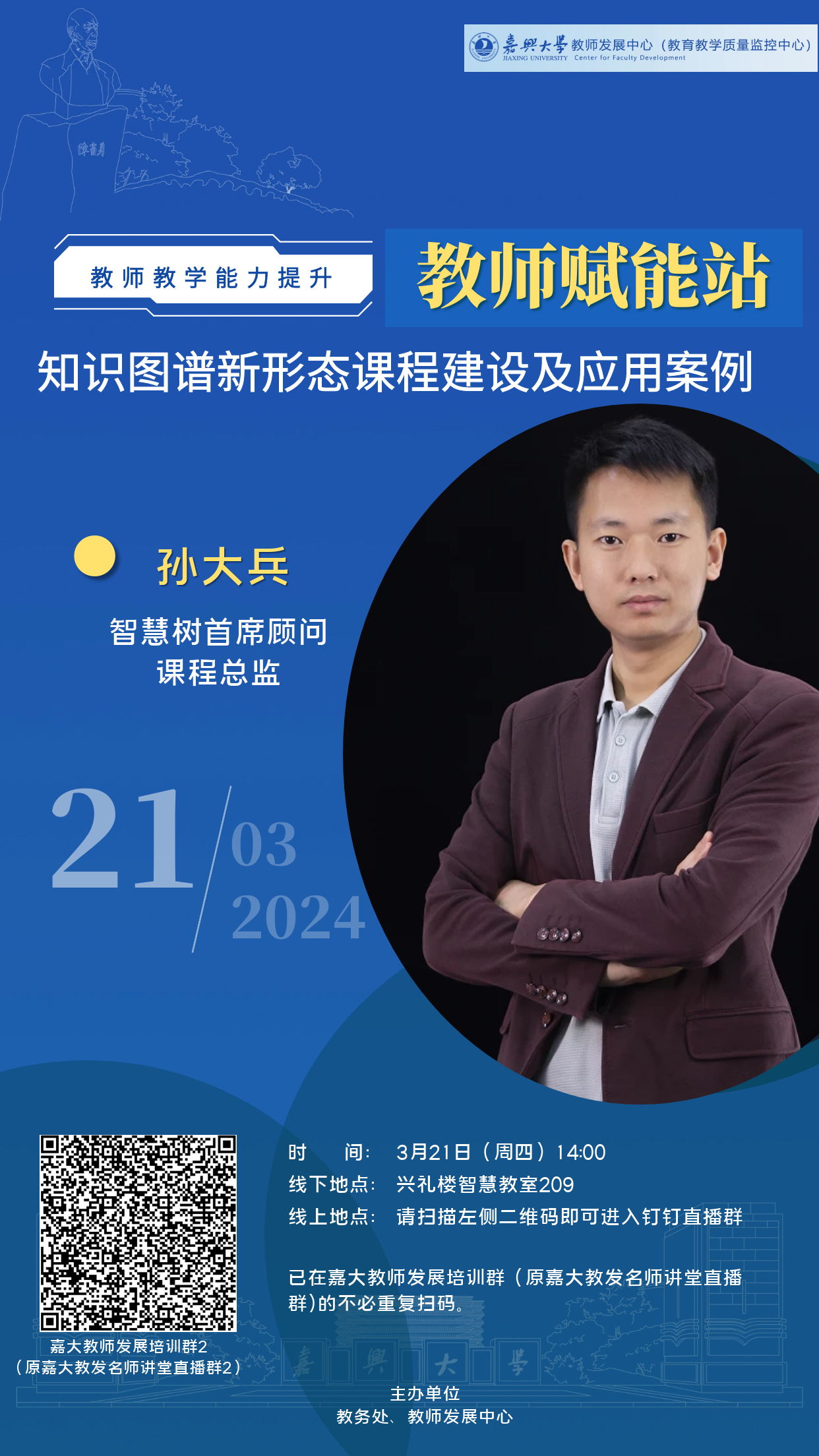 | 2024/03/21- 2024/03/21 | 线下地点:兴礼楼智慧教室209 线上地点:嘉大教师发展培训群(原嘉院教发名师讲堂直播群)、嘉大教师发展培训群2(原嘉院教发名师讲堂直播群2) | 2024/03/19 | 2024/03/21 |