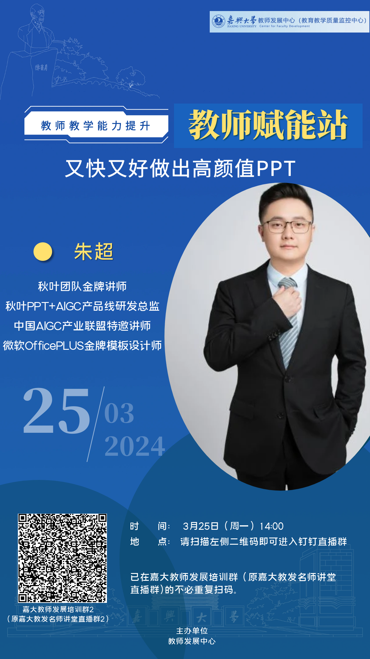 | 2024/03/25- 2024/03/25 | 嘉兴大学教师发展培训群(原嘉院教发名师讲堂直播群)、嘉兴大学教师发展培训群2(原嘉院教发名师讲堂直播群2)。 | 2024/03/21 | 2024/03/25 |