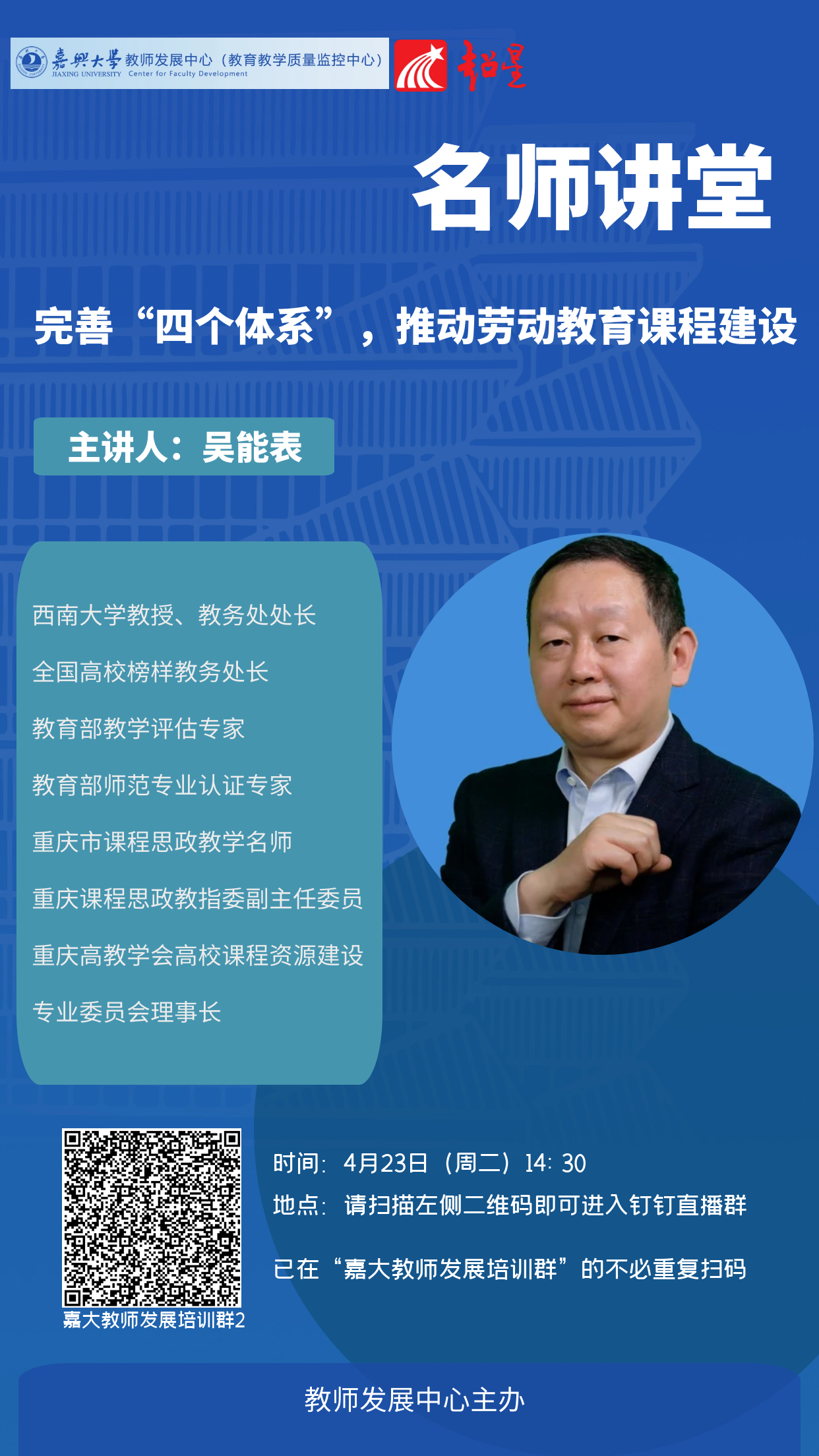 为深入推进新时代大学生劳动教育课程建设,教师发展中心决定举办“完善‘四个体系',推动劳动教育课程建设”讲座,现将具体事项通知如下: