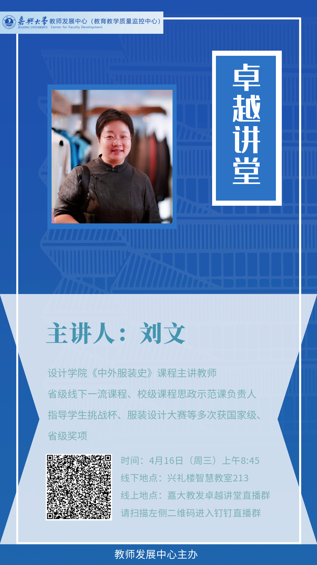 1 | 中外服装史 | 刘 文 | 4月16日(周三)第二节,8:45 | 兴礼楼 智慧教室 213 | 嘉大教发卓越讲堂直播群 |