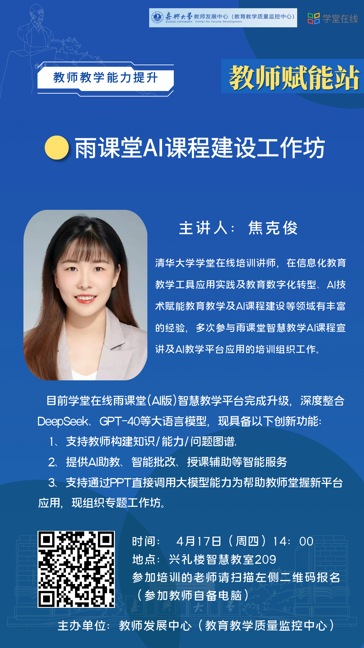 为助力我校深度开展人工智能时代的教学创新,提升教师对人工智能技术在教育领域应用的理解与实践能力,教师发展中心联合学堂在线决定开展雨课堂AI课程建设工作坊,现将具体事项通知如下: