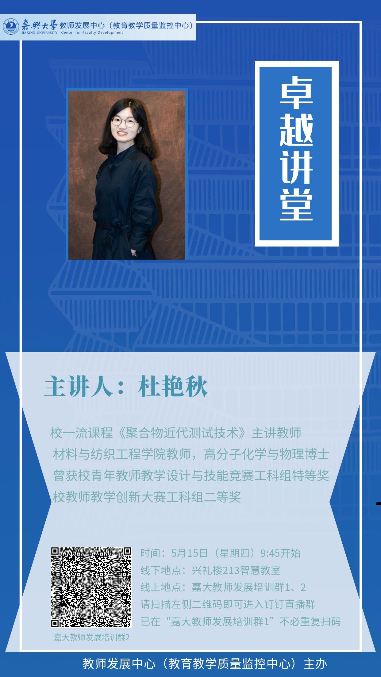 | 杜艳秋 | 5月 15 日(周四)第 3节,9:45 | 兴礼楼 智慧教室 213 | 嘉大教师发展培训群1/2 |