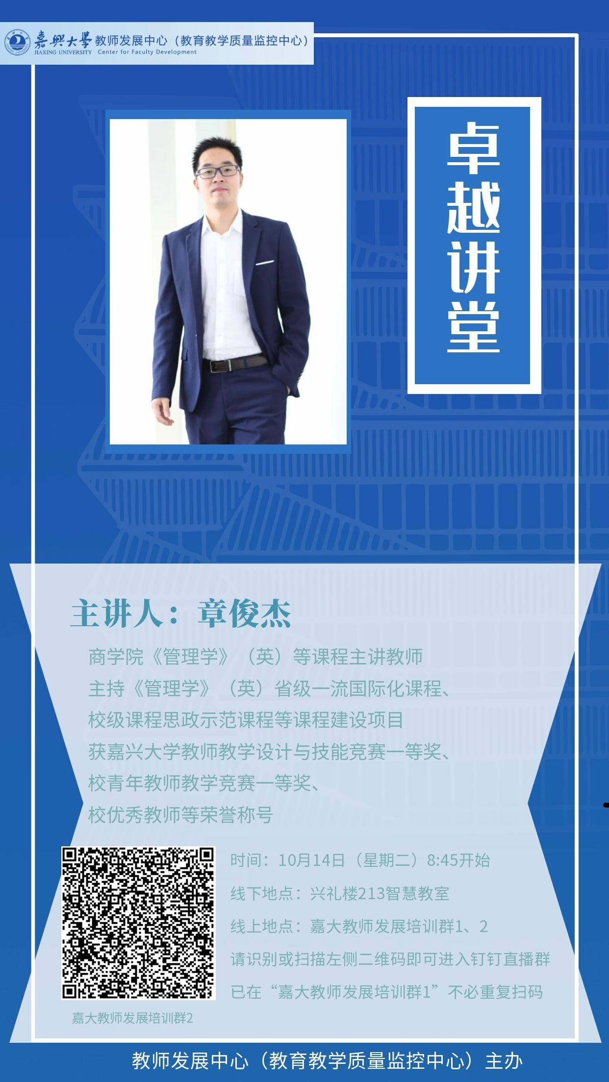 章俊杰,副教授,现任商学院主讲教师,承担《管理学》(英)、《战略管理》(英)、《公司全球化发展》(英)等课程的教学工作。主持《管理学》(英)省级一流国际化课程、校级课程思政示范课程等多项课程建设项目。曾获嘉兴大学教师教学设计与技能竞赛一等奖、校青年教师教学技能大赛一等奖,并荣获校级优秀教师等荣誉称号。