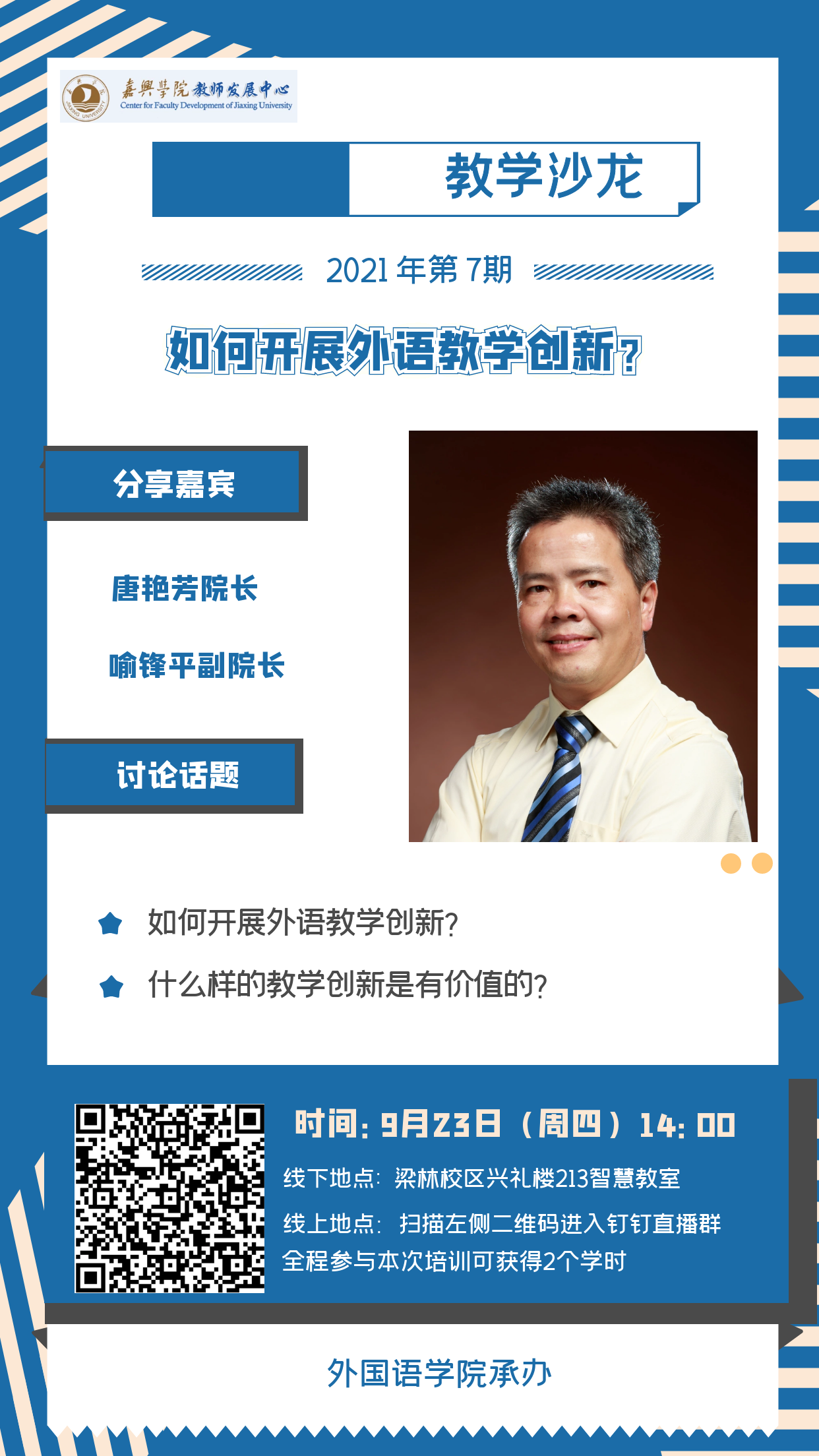 嘉兴学院2021年第七期教学沙龙活动即将启动,将由外国语学院承办,平湖师范学院(应用技术学院) 、文法学院合作组织,现就本期活动的有关事项通知如下: