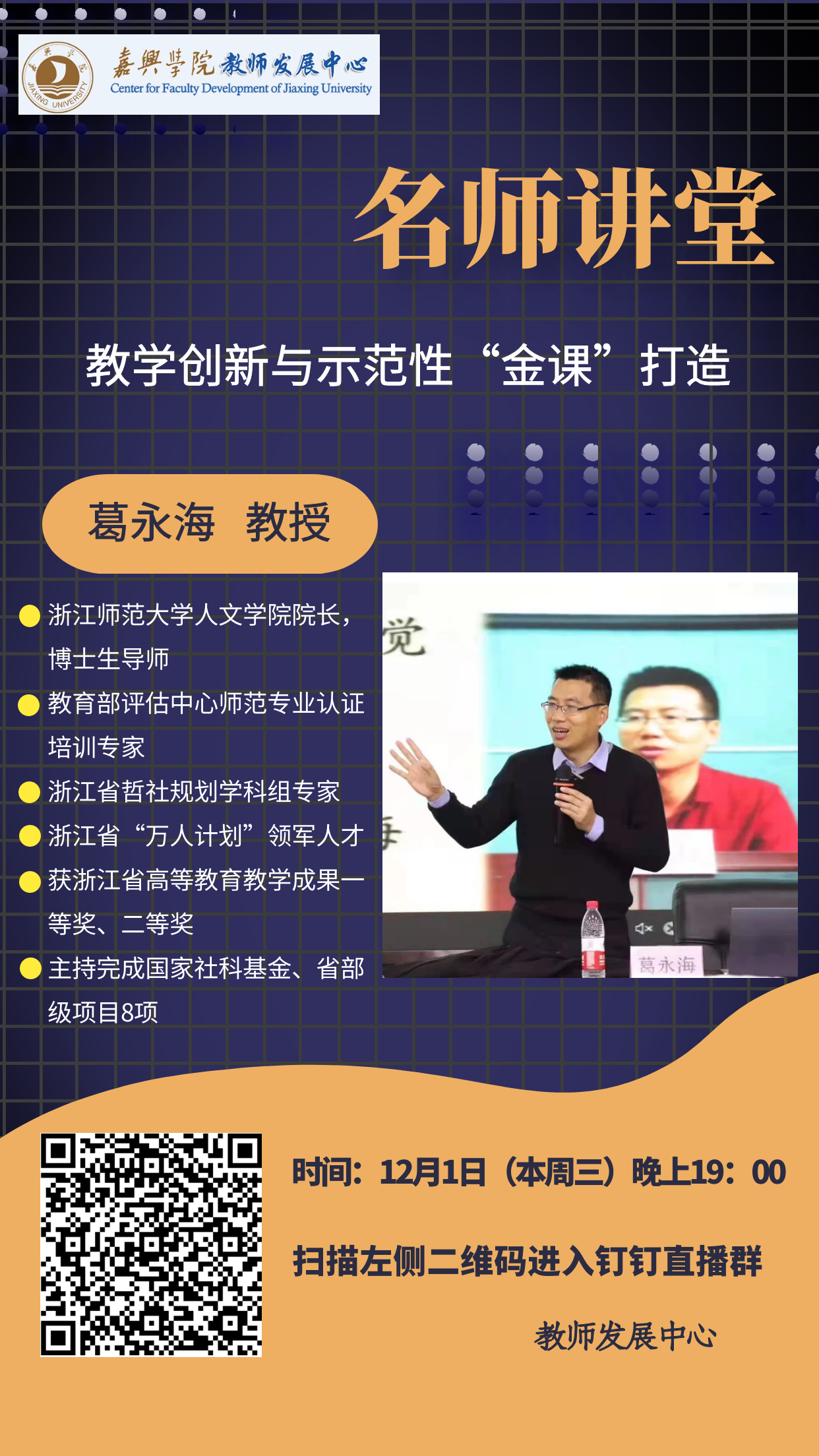 12月1日(本周三)晚上19:00,嘉院教发名师讲堂直播群(详见海报)。