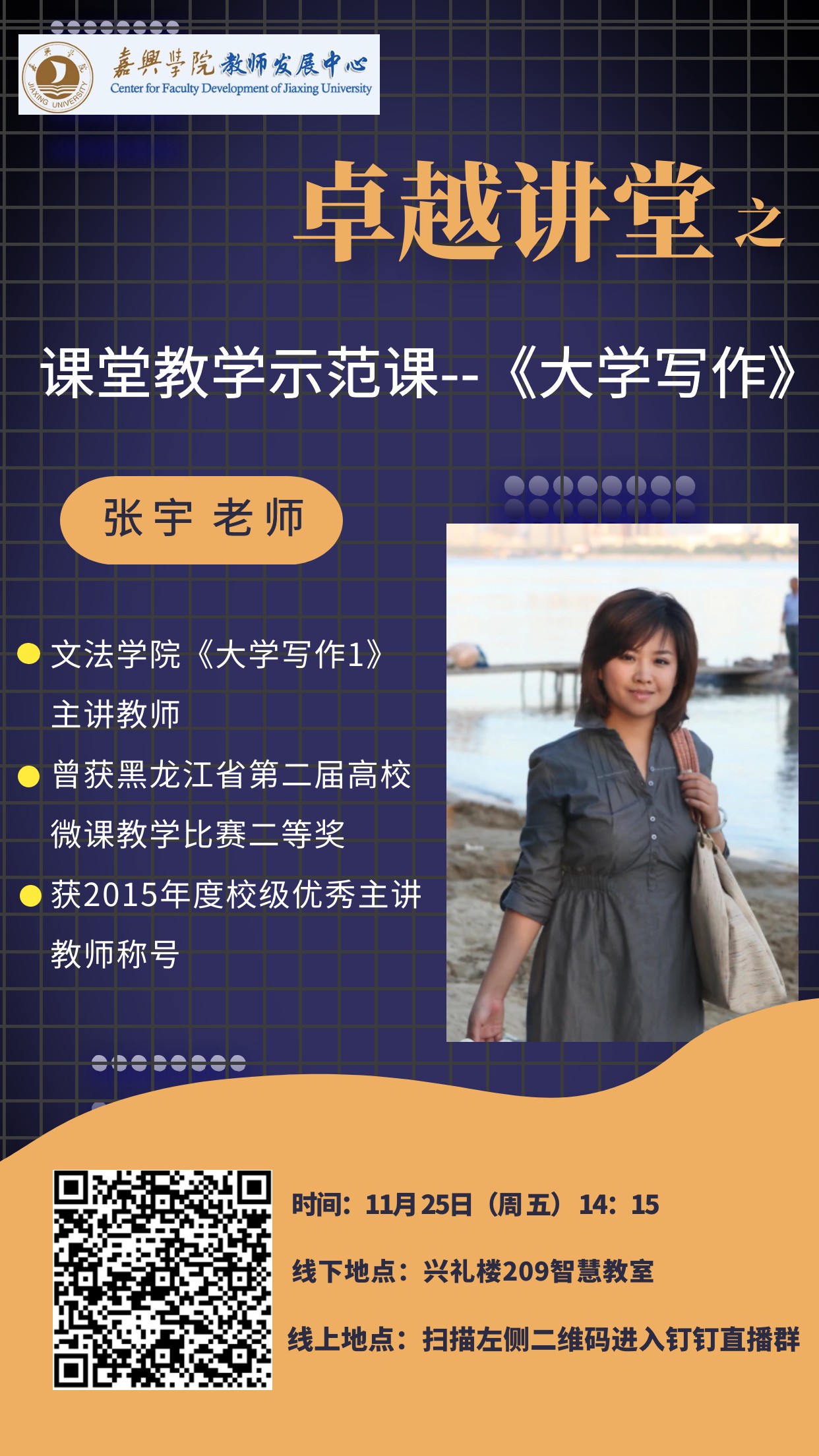 第四场 | 《大学写作》 | 张 宇 | 11月25日(周五)第七节课14:15 | 兴礼楼209智慧教室 |