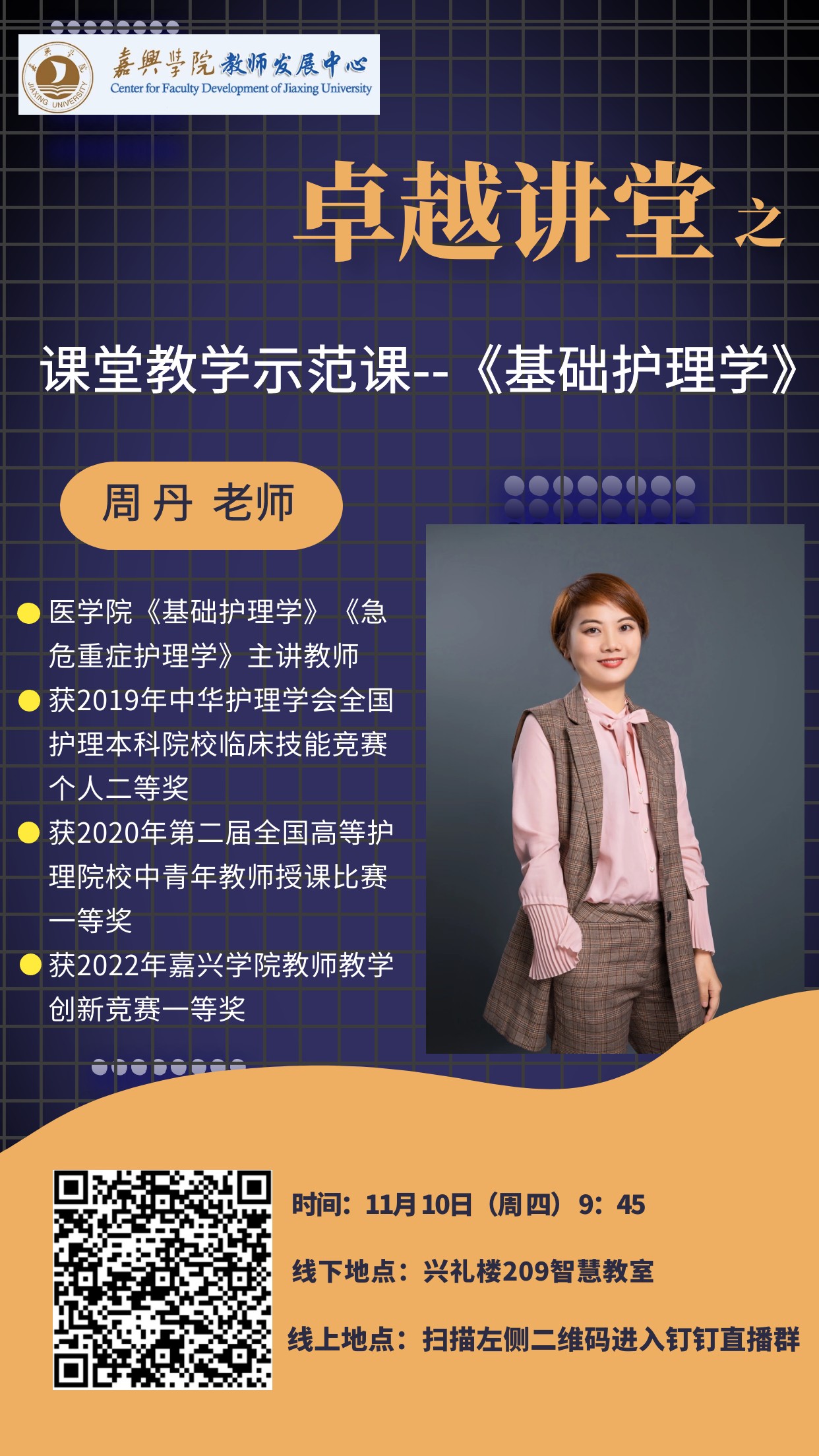 第二场 | 《基础护理学》 | 周 丹 | 11月10日(周四)第三节课9:45 | 兴礼楼209智慧教室 |