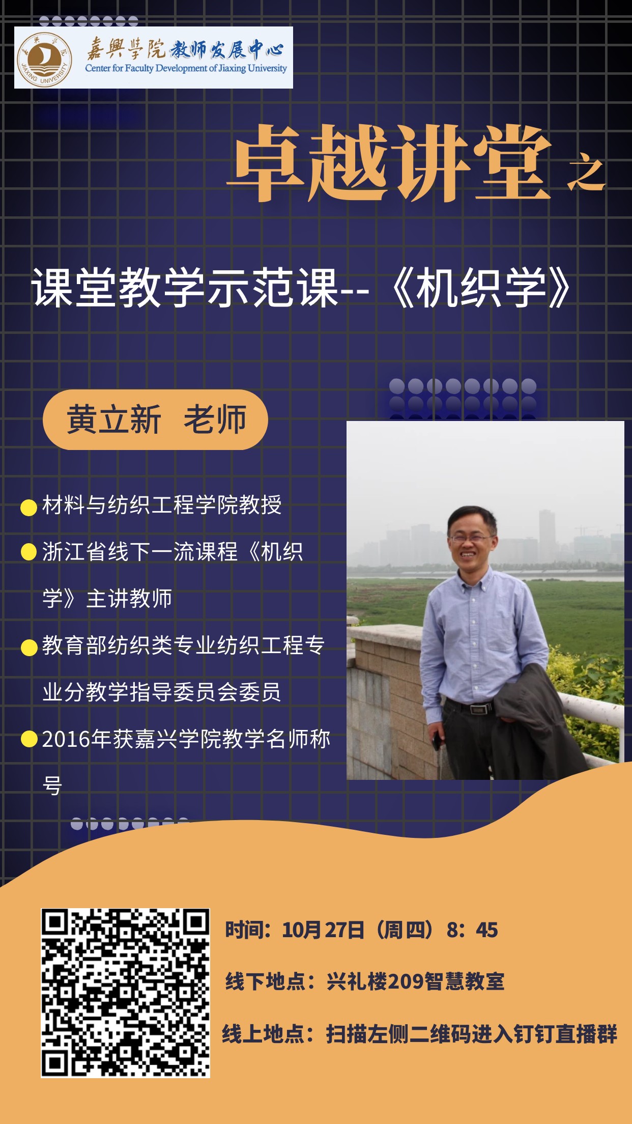 第一场 | 《机织学》 | 黄立新 | 10月27日(周三) | 兴礼楼209智慧教室 |