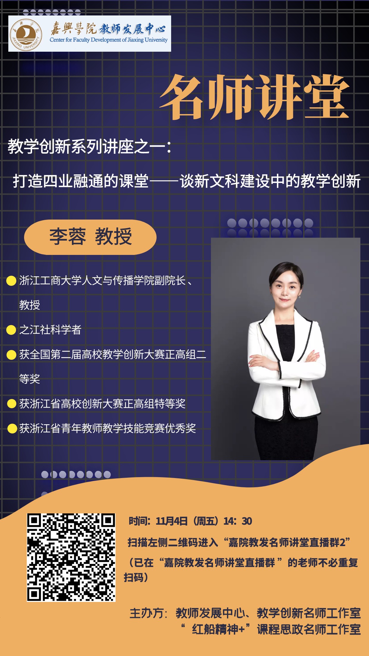 为全面提升教师教学创新能力,也为老师参加第三届“教学创新大赛”校赛提供更多针对性指导,教师发展中心名师讲堂特邀浙江工商大学李蓉教授做专题讲座,现将具体事项通知如下:
