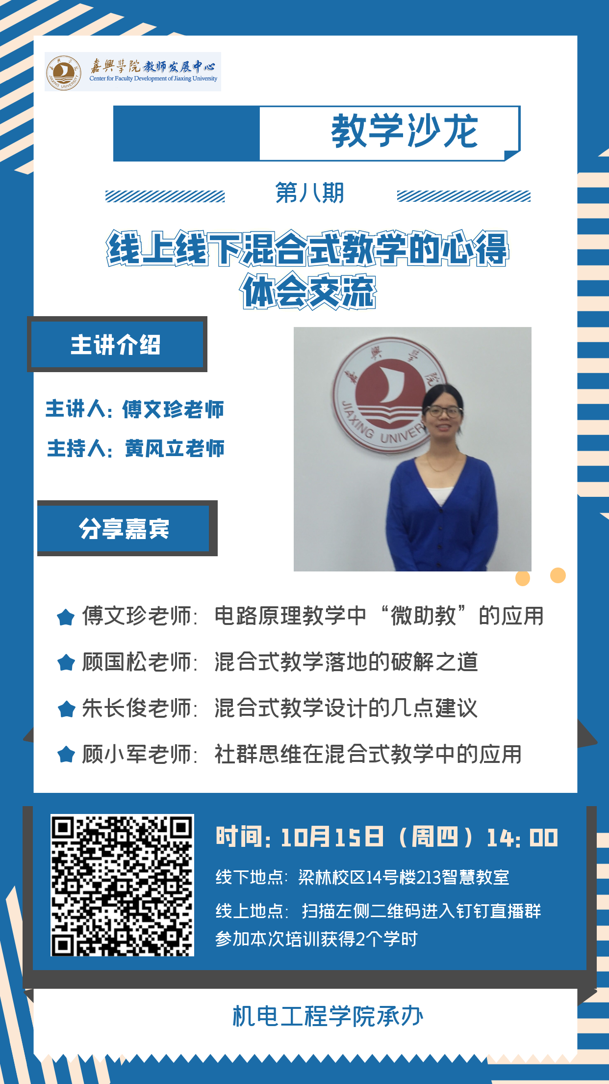 线上地点:嘉院教发教学沙龙直播群。请扫描海报中的二维码(见附件)即可进入钉钉直播群,届时参加教学沙龙活动。为了便于统计参与情况、授予教师培训学时,请参与的教师进群后将备注统一改为“真实姓名+一卡通号”。
